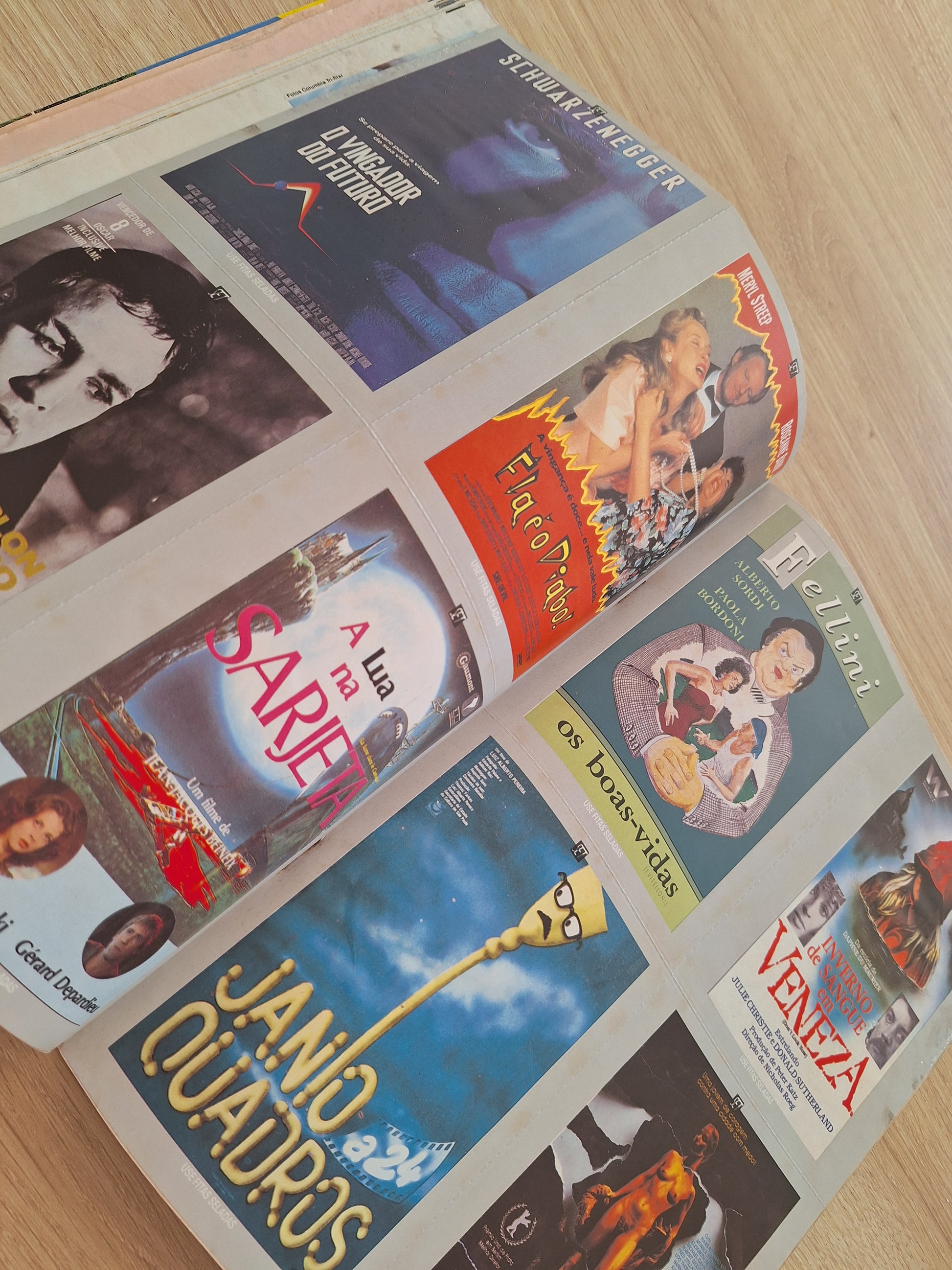 Com fichas de filmes.